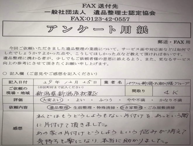 ●今年中におばあちゃんが帰ってくるので家の中の不用品を処分して下さい。(新潟市東区:女性)
